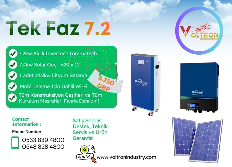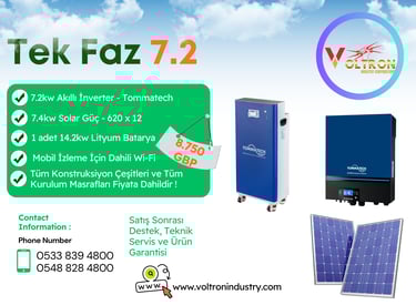 Tek Faz Standart Müstakil Ev Projeleri İçin Tasarlanmış ve 7.2kw Elektrik Araç Şarjına Uygun Ekonomik Bir Güneş Enerji Paketimizdir.